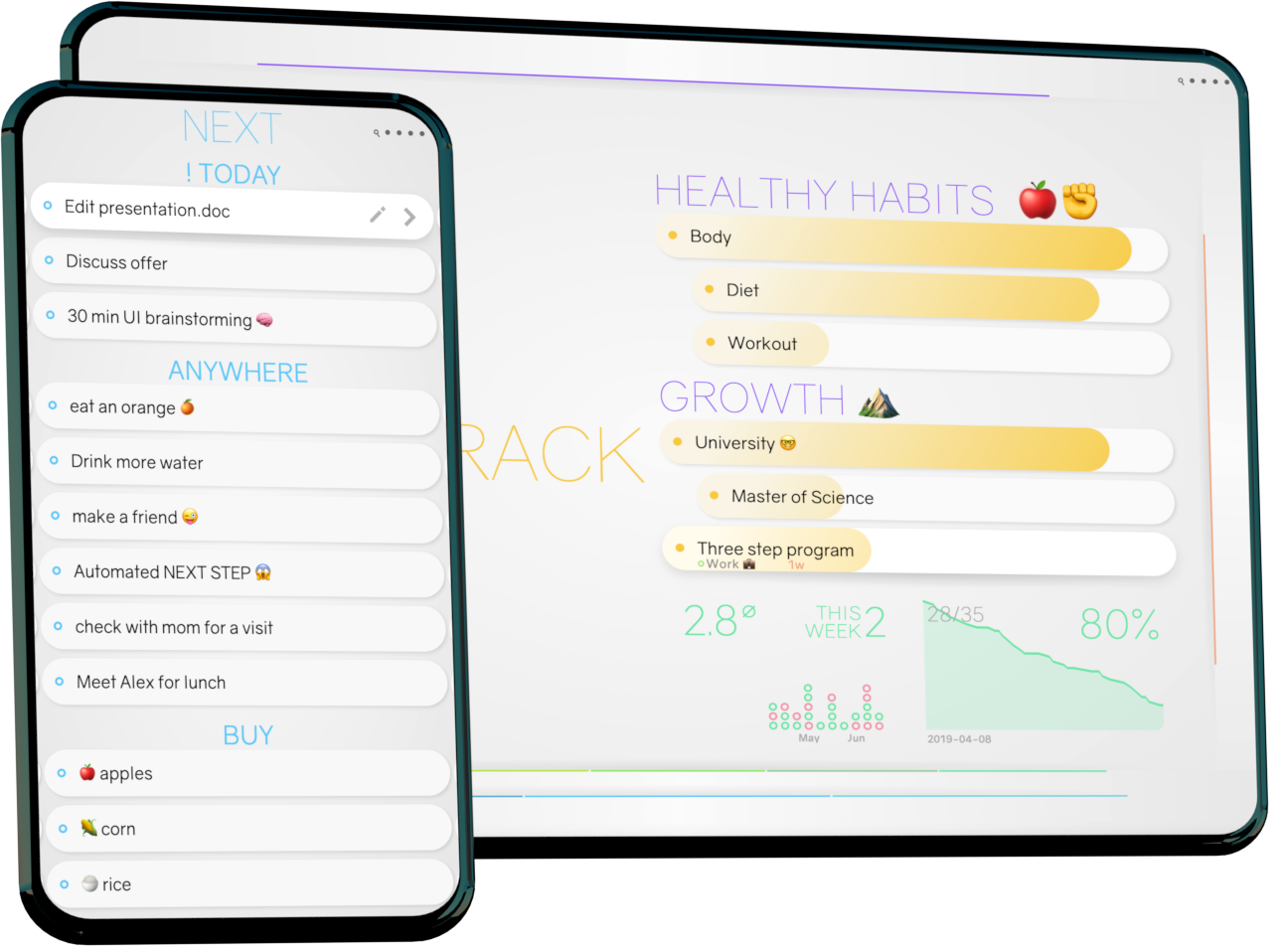 momentum automatically takes the first drop of your ACTIVE projects and shows it in a defined context. This way you can stay focused and get s**t done NOW.